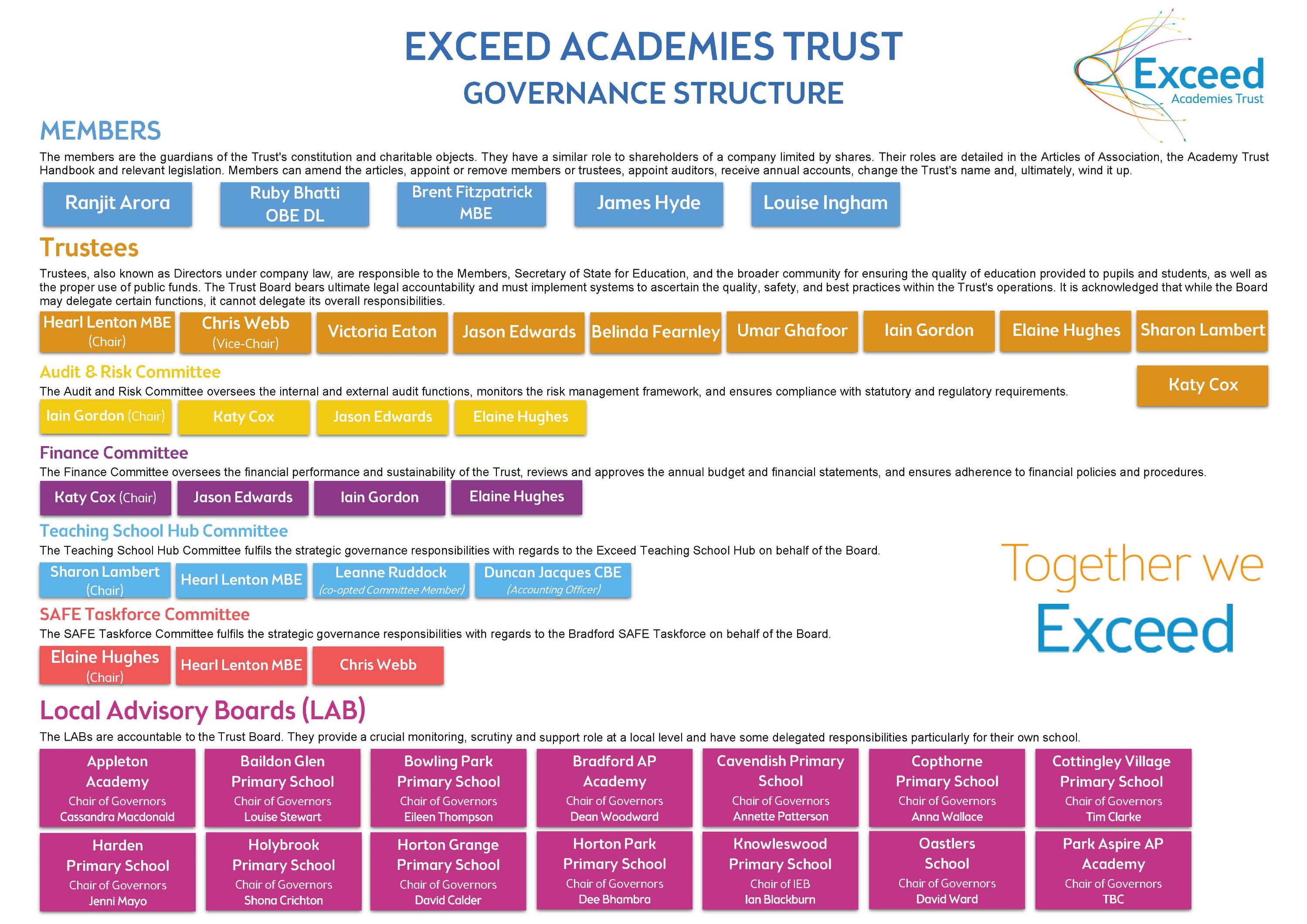 Exceed Academies Trust is a private limited company by guarantee and a charitable trust. Responsibility for the schools that make up the trust and for the funds granted by Parliament for providing education in those schools is entrusted to the Board of Trustees.