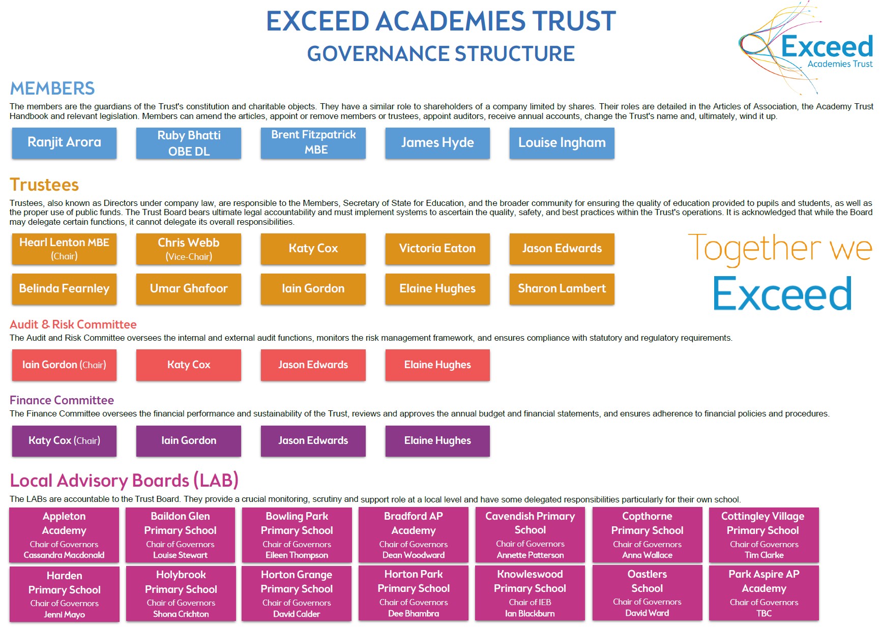 Exceed Academies Trust is a charitable company limited by guarantee. This means the Board of Trustees (who are also company Directors) is legally responsible for the performance of all schools in the Trust and for how public funds are spent.
